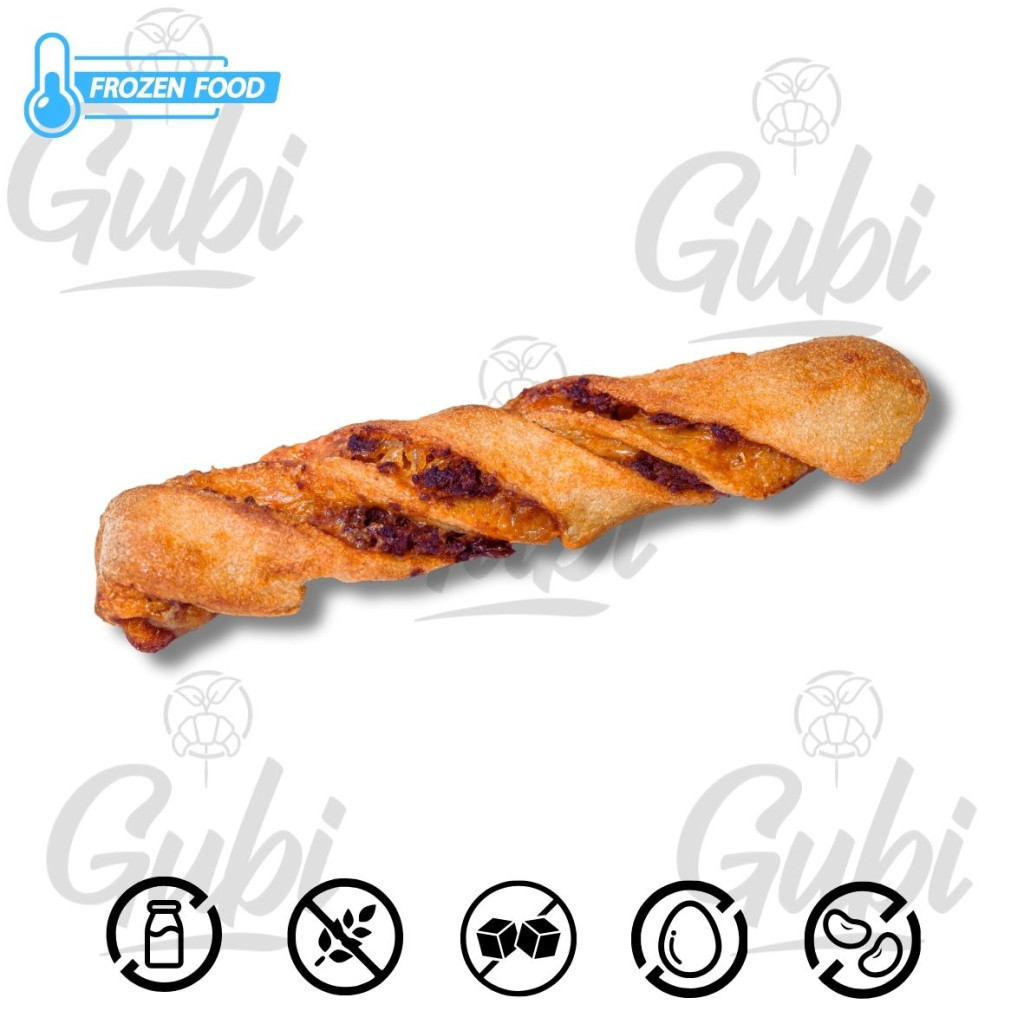 Gubi lisztkeverék (barnarizs liszt, tápióka keményítő, bambuszrostliszt, kölesliszt, aranylenmagliszt, útifűmaghéjliszt), sütőpor, vegán vaj (növényi zsírok és olajok, víz, só, citromsav, béta karotin), só, víz, borecet, paradicsomszósz, kolbász (só, bors, paprika, kömény, fokhagyma, sertéshús, sertészsiradék), vegán sajt (ivóvíz, burgonya- és kukorciakeményítő, só, E202, E330, kókuszzsír, E160a), olívaolaj.