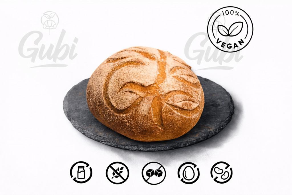 Ez a cipó kiváló szendvicsalap, tökéletes reggelihez, uzsonnához, pirítóshoz vagy akár leves mellé is. Letisztult összetevőkkel dolgozunk: a saját Gubi lisztkeverékünk barnarizs- és kölesalapon készül, útifűmaghéjjal és bambuszrosttal, így az állaga stabil, mégis könnyed. Az olívaolaj és a vegán vaj lágyabb textúrát ad neki, a vadkovász pedig mélyebb, „kenyeresebb” ízt.